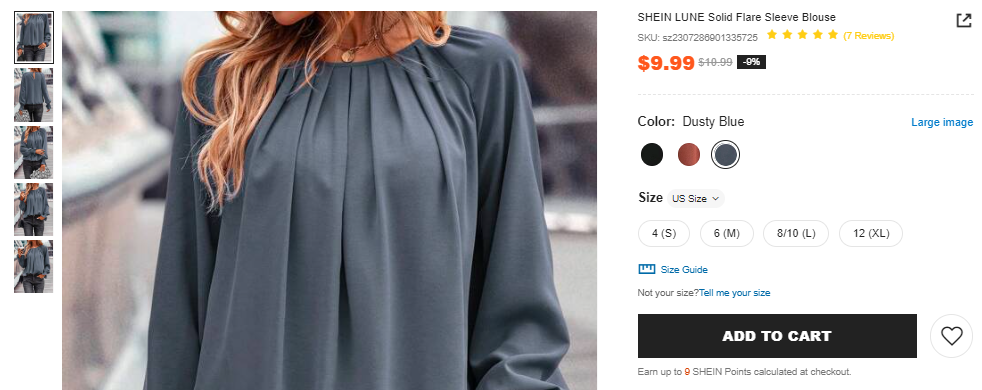 Shein’s product images are zoomable, allowing users to have a closer look at the texture of the clothes and the material. This increases the likelihood of the customer going through with a purchase because they get all the necessary information they need.