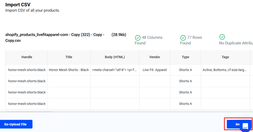 Upload your CSV file, which will display a product preview. Once reviewed, click Next.
