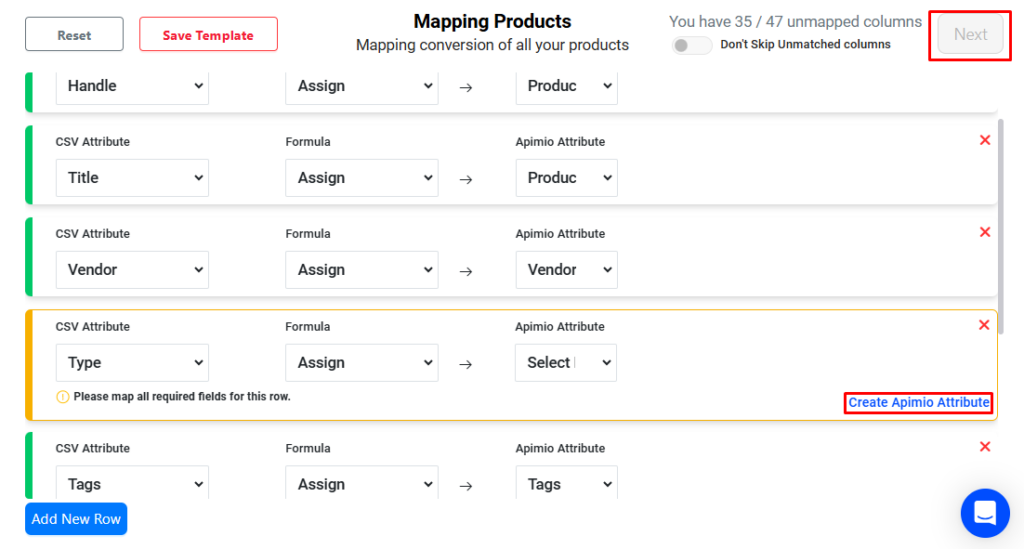 Next, you’ll be directed to the mapping page. Map the fields from your CSV file to the corresponding Apimio attributes, or you can create custom attributes as well.