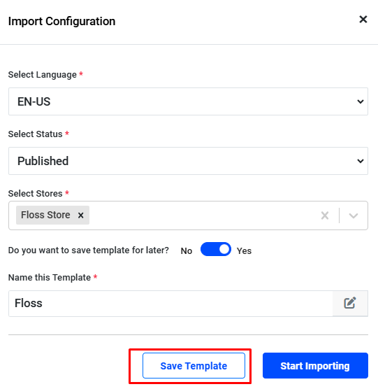 Specify the language and store where the products should be added. You can also save this setup as a template by adding a template name for future imports.